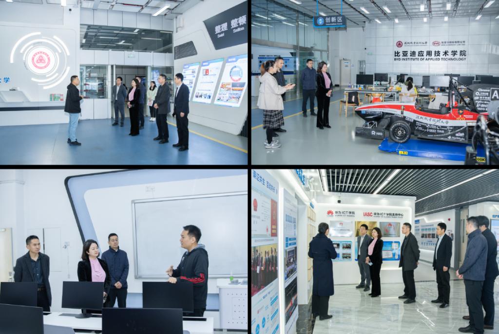 在深圳职业技术大学和华为公司领导的陪同下,刘珂书记一行实地走访并重点调研了电子与通信工程学院(华为产教融合人才培养示范中心、华为信息与网络技术学院)、汽车与交通学院(比亚迪应用技术学院)和人工智能学院。调研组详细了解了各产业学院的运行机制、课程体系构建、实训基地建设、技术研发与社会服务开展情况,并就深化“政行企校”协同、推动教育链与产业链有机衔接等议题,与相关学院负责人及技术骨干进行了深入探讨。深圳职业技术大学在紧密对接头部企业、精准服务产业升级、创新实践教学模式等方面取得的显著成果给调研组留下了深刻印象,启发颇多。