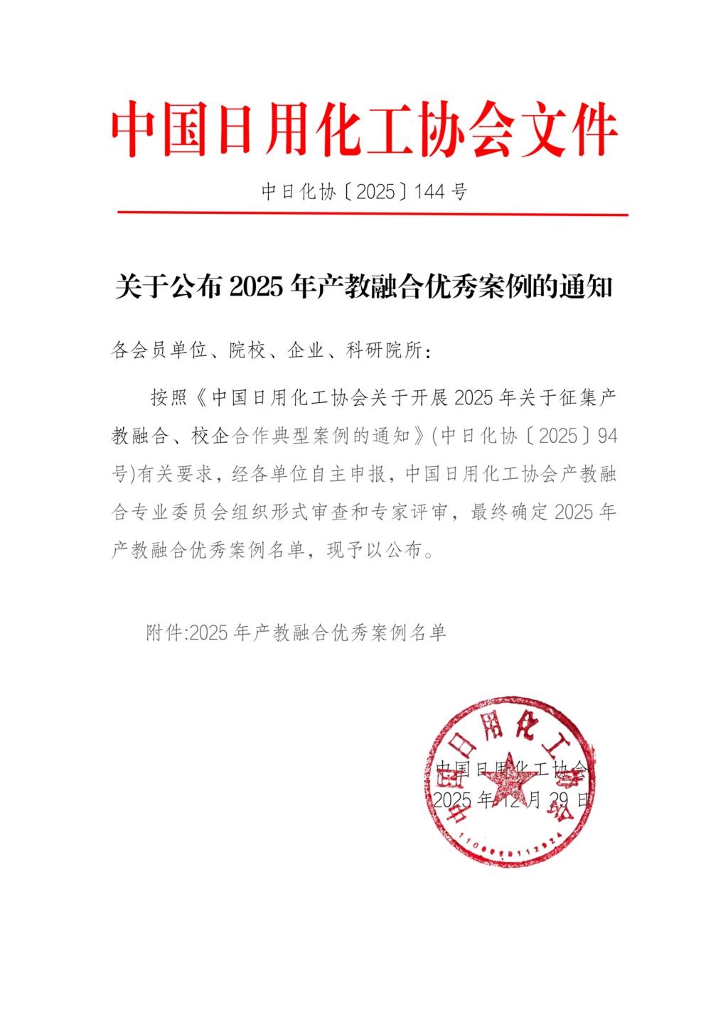 12月29日,中国日用化工协会发布了《关于公布2025年产教融合优秀案例的通知》(中日化协〔2025〕144号),正式公布2025年产教融合优秀案例名单。我院凭借在产教融合、校企合作方面的扎实探索与创新实践,共有五个案例成功入选,获奖数量在所有学校中名列第一。
